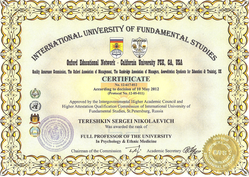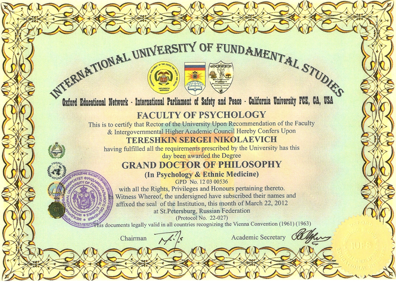 Гранд-доктор философии в области психологии, кандидат филологических наук, полный профессор МУФО